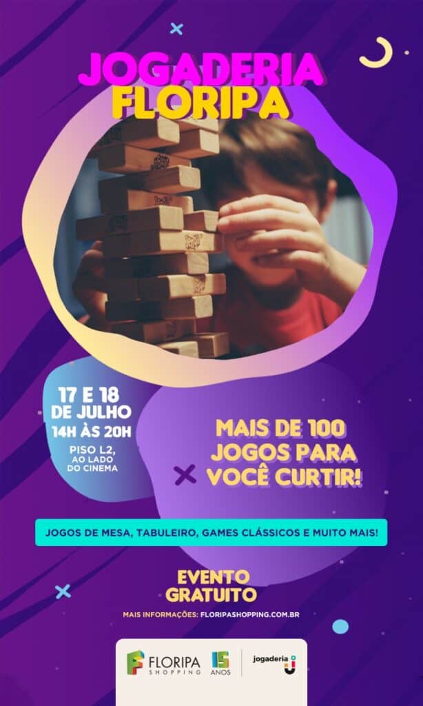 Nada de aplicativos ou diversões eletrônicas! Nos dias 17 e 18 de julho (sábado e domingo), o Floripa Shopping te convida para reunir a galera no mall e brincar com os jogos de tabuleiro mais legais. Dos modernos aos clássicos, muitos vindos diretamente da década de 80. São mais de 100 opções, entre elas Ludo, War, Banco Imobiliário e Imagem em Ação, além dos mais atuais como Dixit, Coup, Azul, Catan, Jenga, entre outros.