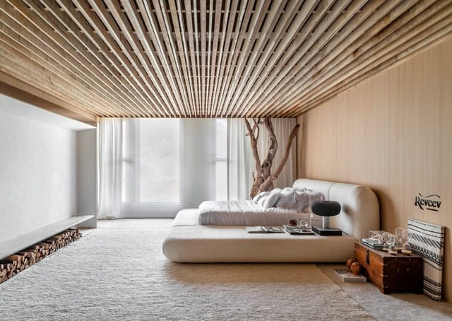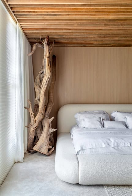 Quarto Suna Reveev – Osvaldo Segundo & Arquitetos Associados. “Suna” significa areia em japonês e assim como nome diz, este ambiente busca sensações de calma e fluidez. Celebra a beleza imperfeita, a impermanência da vida. A arquitetura traz diferentes texturas e elementos naturais, unidos por tons claros e linhas sóbrias. O contemporâneo aliado às raízes culturais, o minimalismo combinado ao tradicional, o senso estético puro embasado à função.