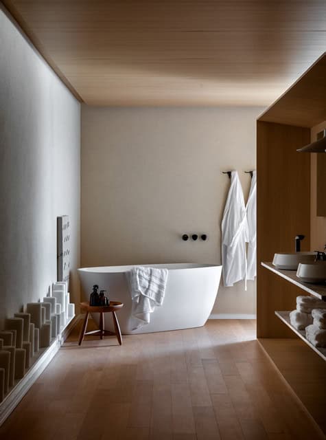 O Quarto Suna utiliza no piso do ambiente de banho madeiras Tauari sustentáveis de florestas com plano de manejo e certificadas pelo Ibama, da mesma forma que o teto de madeira ripado, que lembra os painéis japoneses Shōji e também os antigos estrados de colchões. A modulação do teto foi pensada para também ser reaproveitada após o término da mostra. O mesmo vale para a marcenaria, feita em painéis MDF com selo de certificação sustentável, paginada para ser reutilizada posteriormente.