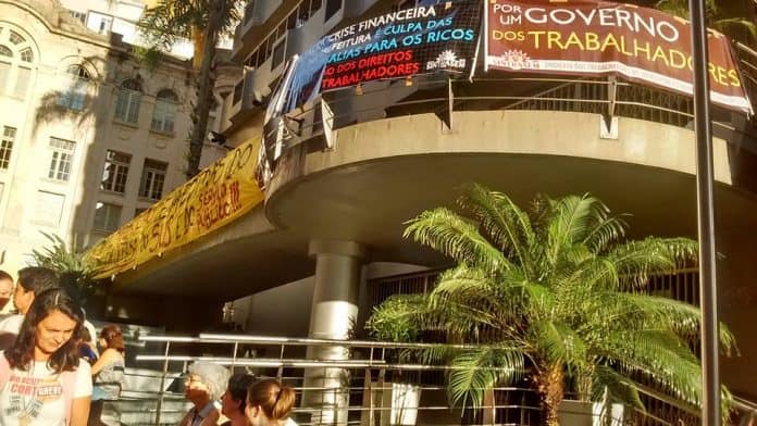 Os servidores municipais em greve, contrários ao pacote de medidas, chegaram cedo na Câmara de Vereadores para protestar contra as medidas em votação.