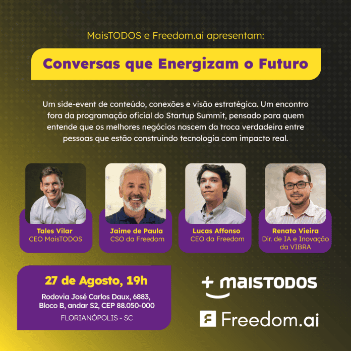 Também estará presente o empresário Jaime de Paula, criador da Neoway – uma das maiores na área de análise de big data e inteligência artificial para negócios do País –, que foi vendida para a B3 em 2021 por R$ 1,8 bilhão. Hoje Jaime é um dos fundadores da Freedom. Criada a partir de investimentos de mais de 6 milhões de dólares, a empresa oferece uma plataforma unificada para criação e gestão de agentes de IA personalizados.