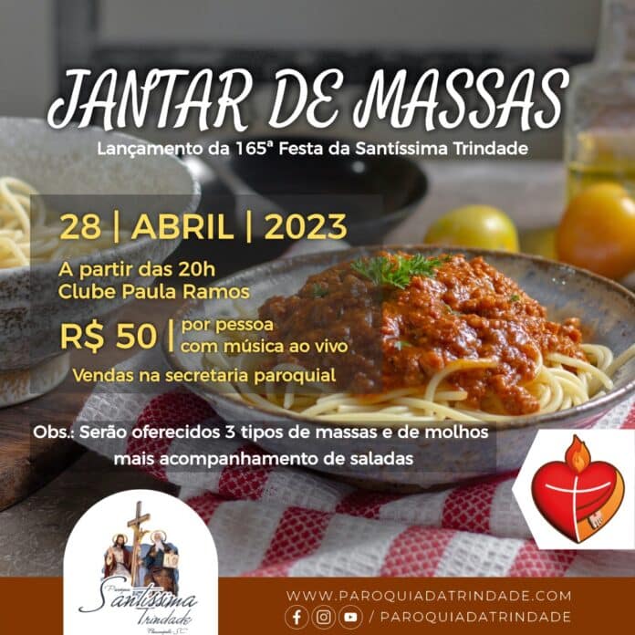 Na próxima sexta-feira (28), às 20h, no Clube Paula Ramos, a Paróquia da Trindade, em Florianópolis, realizará o Jantar de Massas em prol da 165ª Festa da Santíssima Trindade.