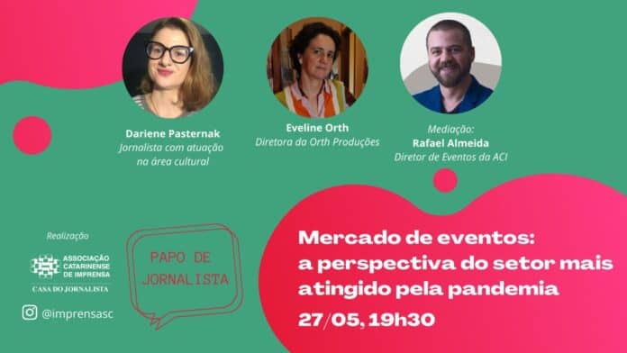 O "Papo de Jornalista" dessa semana acontece na quinta-feira (27), às 19h30 e debate as perspectivas para o setor de eventos, que foi drasticamente afetado pela pandemia. A transmissão é realizada ao vivo e pode ser acessada pelo perfil do Instagram da Associação Catarinense de Imprensa (@imprensasc). As convidadas Dariene Pasternak e Eveline Orth batem um papo sob a mediação do Diretor de Eventos da ACI, Rafael Almeida.