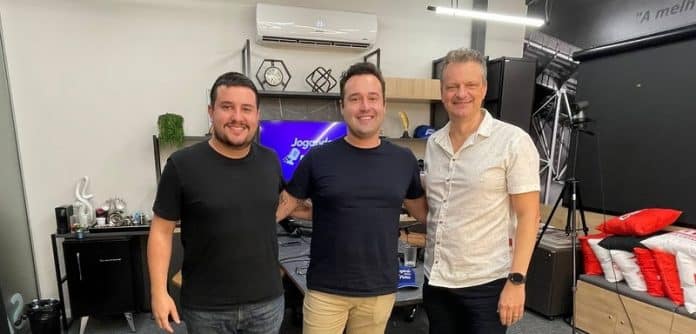 Fernando D’aquino e os apresentadores do podcast “Jogando para a Plateia”, Jimmy e Fábio Ferrari – Foto: Divulgação |