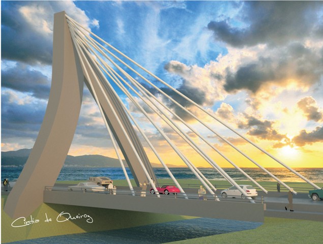Idealizado para composição arquitetônica do complexo viário de ligação desses dois municípios, o Pórtico tem projeto ousado mesclando estrutura metálica e de concreto armado em modelo estaiado, formado por um pilar de onde partem 12 cabos de aço.