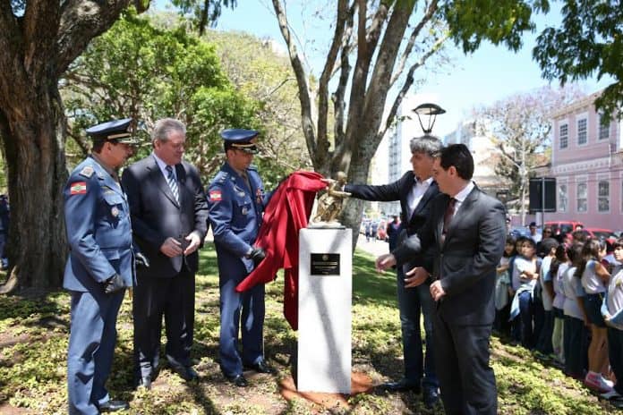 A estátua de um soldado preparado para o combate foi instalada bem em frente ao Batalhão do Corpo de Bombeiros de SC, próximo da Rua Visconde de Mauá.