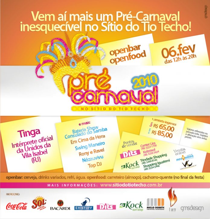 A 8ª edição do Pré Carnaval no Sítio do Tio Techo apresenta inúmeras atrações para levantar o seu espírito carnavalesco e reunir seus amigos e familiares para boa uma diversão. Não perca tempo e fique atento a todas as novidades desta tradicional festa que acontecerá no dia 06.02.2010 (sábado que antecede o carnaval), das 12:00h às 20:00h!