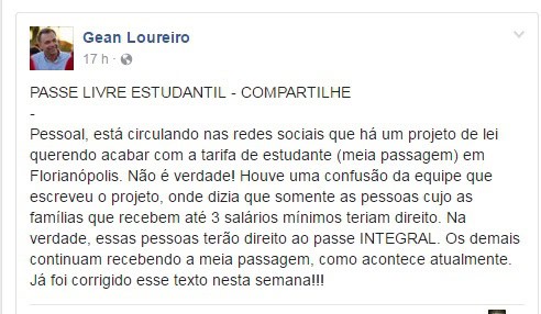 No projeto que será encaminhado pela Câmara de Vereadores afirmava que só teriam direito a meia tarifa o estudante cuja família recebe até três salários mínimos. Gean Loureiro afirmou que isso não passou de um erro no texto e que já foi corrigido.