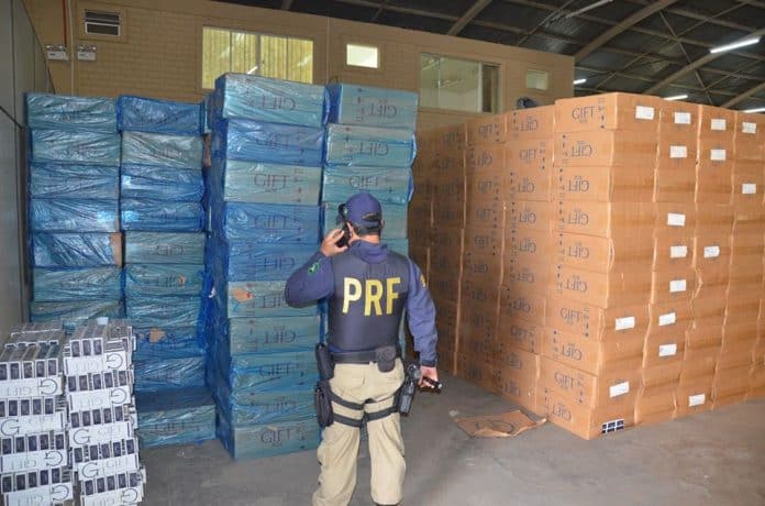 Policiais rodoviários federais descobriram neste sábado, 18, em São José, na Grande Florianópolis, um grande centro de distribuição de cigarros contrabandeados. Dentro de um depósito alugado, no bairro Barreiros, foram encontradas aproximadamente 3 mil caixas, ou cerca de um milhão e 500 mil maços de cigarros paraguaios. Essa quantidade equivale a três carretas totalmente carregadas com o produto. A mercadoria apreendida está avaliada em mais de R$ 7 milhões. Cinco homens foram presos e duas carretas roubadas foram apreendidas.