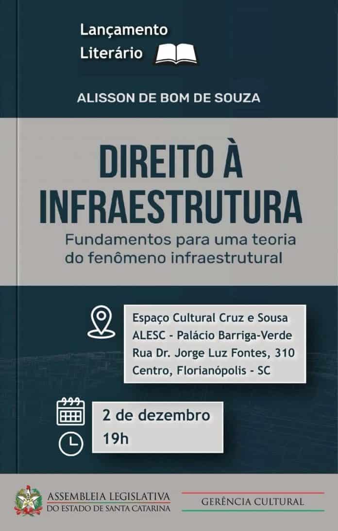 A Assembleia Legislativa do Estado de Santa Catarina (ALESC) sediará, no próximo dia 2 de dezembro, às 19h, o lançamento da obra ‘Direito à Infraestrutura: Fundamentos para uma Teoria do Fenômeno Infraestrutural’, de autoria do procurador do Estado Alisson de Bom de Souza. O evento acontecerá no Espaço Cultural Cruz e Sousa, localizado no Palácio Barriga-Verde, no centro de Florianópolis.