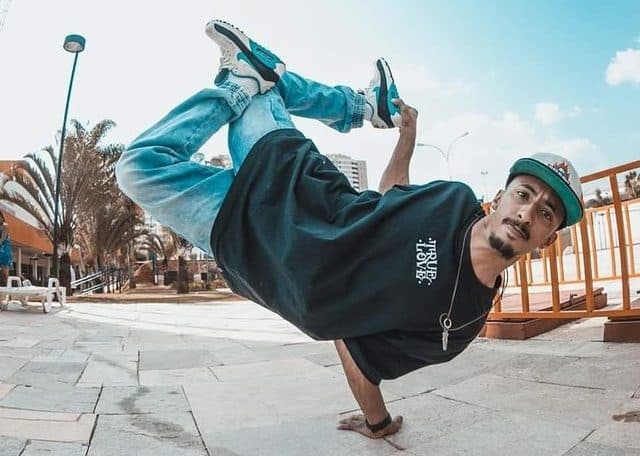 “Estava andando de skate perto de casa, passei por uma garagem e tinha uns meninos dançando breaking. Me apaixonei, tanto que até larguei o skate. E eu era bom, viu? Mas com a dança foi amor à primeira vista”, conta o B-Boy.