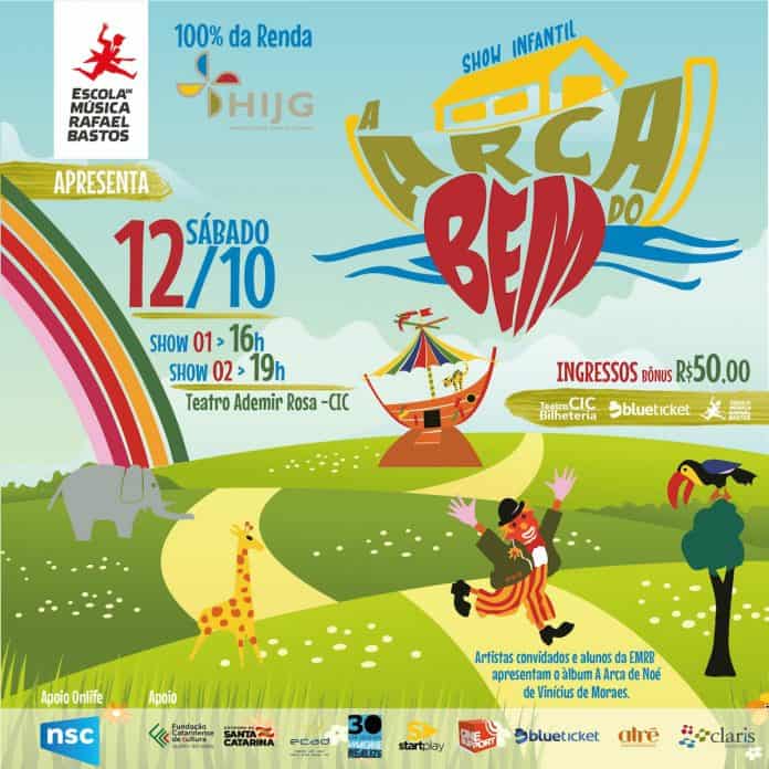 O “Arca do Bem” é uma realização da Escola de Música Rafael Bastos. Patrocínio Unimed-Grande Florianópolis, Engie e Hospital SOS Cárdio. Apoio de Mídia NSC. Os ingressos estão à venda na Blueticket a partir de R$ 37.