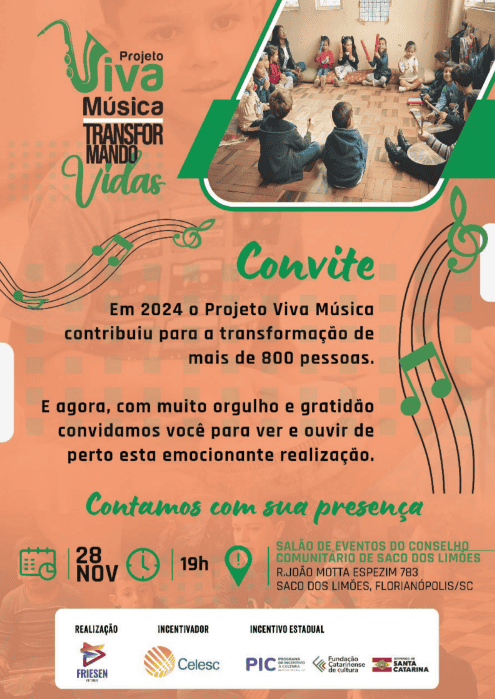 Promover a inclusão social e transformar vidas por meio da música. Esse é o propósito do Projeto Viva Música, uma iniciativa que, há 10 anos, leva ensino musical gratuito e de qualidade a crianças, jovens e adultos em situação de vulnerabilidade social. Além de Florianópolis, o projeto atua nas cidades de Blumenau, Indaial, Ituporanga e Imbituva, impactando comunidades de forma profunda e significativa.