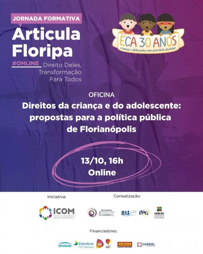 A Jornada Formativa Articula Floripa tem seu 7º encontro nesta terça-feira, 13, às 16h. O Observatório de Inovação Social de Florianópolis, da Universidade do Estado de Santa Catarina (Udesc), apresentará um diagnóstico sobre o Sistema de Garantias dos Direitos das Crianças e Adolescentes em Florianópolis, que envolve organizações públicas e da sociedade civil. A ideia é elaborar uma proposta de política pública para a área, a partir da discussão com pessoas e instituições envolvidas.