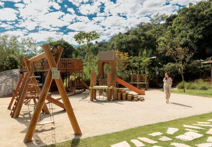 Brincar é necessário e Ana traz estímulos para que seus projetos estimulem o movimento a céu aberto. No projeto de paisagismo encomendado pelo Armazém Rita Maria, que oferece uma ampla carta gastronômica, o jardim provoca a percepção do corpo por meio de vários pontos diferentes no terreno. A área é toda cercada por plantas.
