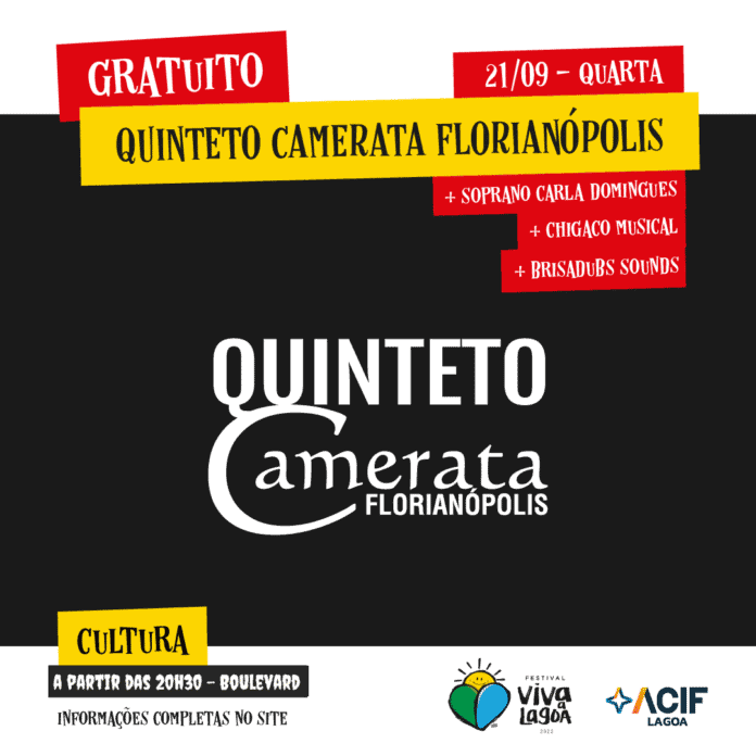 O Quinteto de Cordas da Camerata Florianópolis, juntamente com a soprano Carla Domingues, participarão do Festival Viva Floripa – 8ª edição do Viva a Lagoa, realizado pela Associação Empresarial de Florianópolis (ACIF), nesta quarta-feira (21), a partir das 20h30, no Boulevard – em frente ao trapiche – na Lagoa da Conceição.