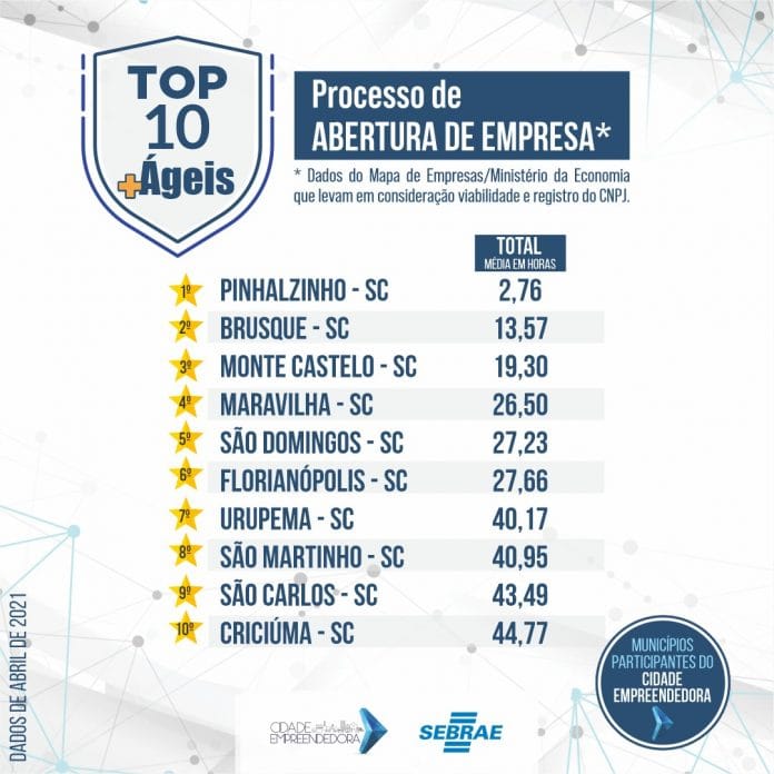 O Sebrae/SC divulgou um ranking em que elencou os dez municípios catarinenses participantes do Programa Cidade Empreendedora que são mais ágeis no processo de abertura de empresas em Santa Catarina no mês de abril. Os dados são do Mapa de Empresas, do Ministério da Economia, e consideram a consulta de viabilidade e o registro do CNPJ. O município de Pinhalzinho, no Oeste, está em 1º lugar, com tempo médio de 2,76 horas.