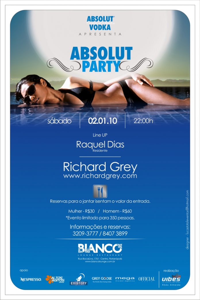 O francês Richard Grey abre a programação festiva do Bianco Lounge Restaurant. Residente em um club de Ibiza, a famosa ilha espanhola, mas apaixonado pelo Brasil, o DJ é o convidado especial deste sábado, 2 de janeiro, em noite que terá Raquel Dias no Warm up. A festa começa às 22 horas, com ingressos a R$ 30 (feminino) e R$ 60 (masculino). Vale lembrar que quem fizer reservas para o jantar fica isento do pagamento de ingresso.