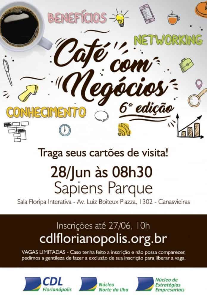 Proporcionar o compartilhamento de ideias entre empresários é o objetivo da próxima edição do “Café com Negócios”, promovido pelos Núcleos de Estratégias Empresariais e Norte da Ilha da CDL de Florianópolis. O encontro será na próxima sexta-feira (28), a partir das 8h30, no Sapiens Parque.