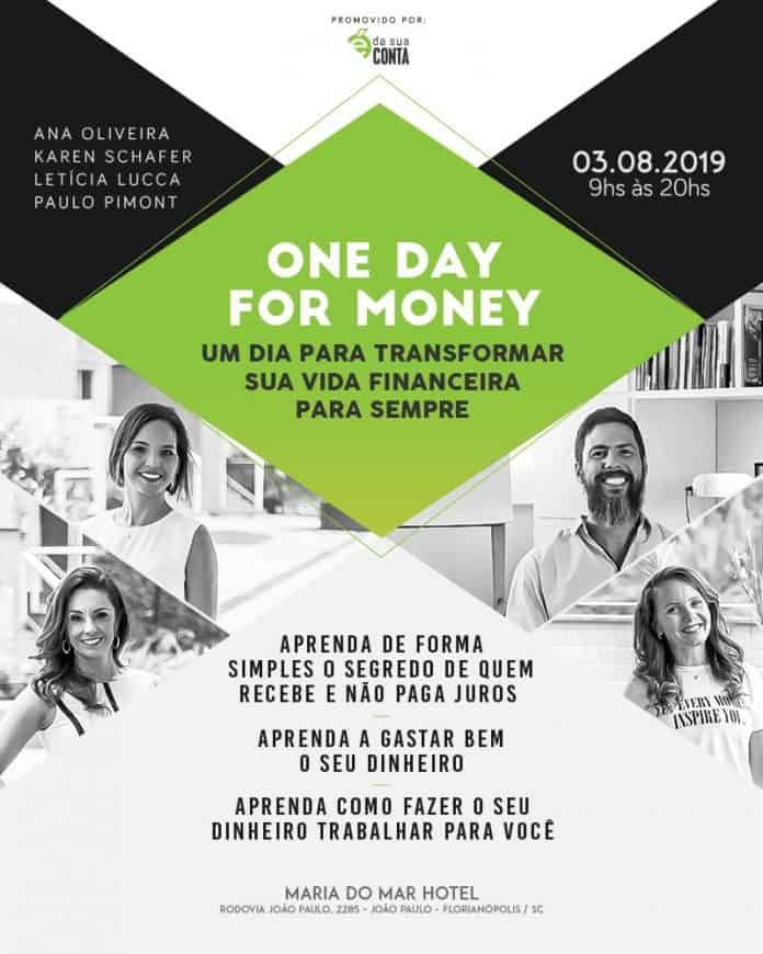 Florianópolis recebe no dia 3 de agosto a última edição do ano, na cidade, do curso de imersão em finanças pessoais “One Day for Money”, voltado para quem busca maior equilíbrio financeiro e quer aprender a economizar, investir e multiplicar o dinheiro para a realização de sonhos e a conquista de um futuro mais tranquilo. As próximas edições serão em Criciúma, Joinville e Blumenau.