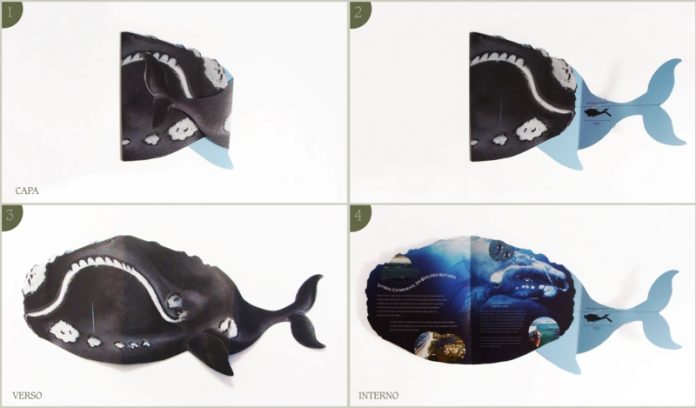 Um folder diferenciado produzido pela D/Araújo Comunicação para a Santur –Santa Catarina Turismo S/A – chama a atenção para esta atividade turística sustentável que movimenta a economia local. O formato e a textura da peça lembram o corpo da baleia franca e trazem informações em português e inglês sobre a espécie e os passeios de observação, que são devidamente acompanhados de especialistas.