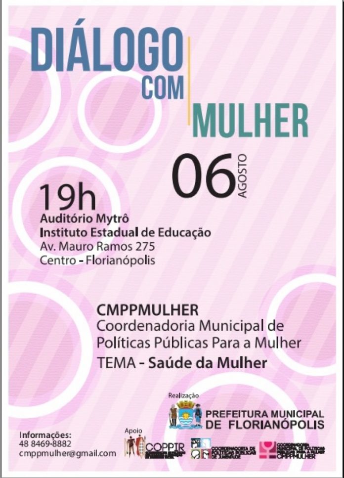 Nesta terça-feira, 6, a partir das 19h, a Coordenadoria Municipal de Políticas Públicas para a Mulher de Florianópolis realiza uma discussão com o tema “Saúde da Mulher”. O encontro tem como objetivo conscientizar o público feminino sobre os cuidados com seu próprio corpo. O encontro é aberto ao público e ocorre no Auditório Mytrô, no Instituto Estadual de Educação. As informações são da rádio CBN/Diário.