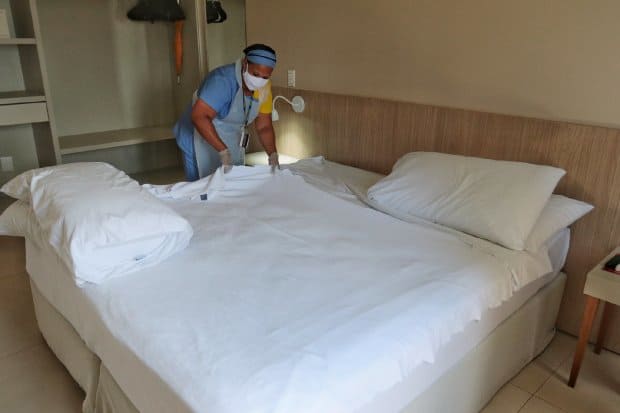 A nova rotina também alcançou o preparo dos quartos para poder receber os hóspedes com segurança. “Utilizamos produtos de limpeza à base de peróxido de hidrogênio, que têm eficácia de desinfecção hospitalar. Os quartos também passam por uma esterilização após o check out com a máquina de ozônio, seguindo o protocolo de 20 minutos” explica Sheila Petri.