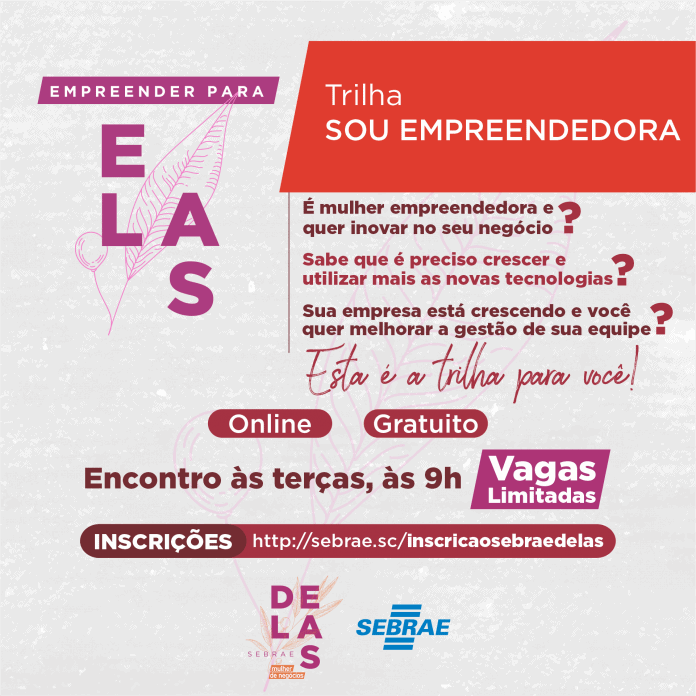 O Sebrae Delas Mulher de Negócios está com inscrições abertas para a trilha “Sou Empreendora”, da jornada Empreender para Elas. Online e gratuita, a trilha é exclusiva para mulheres empreendedoras à frente de micro e pequenas empresas, residentes em Santa Catarina. Serão disponibilizadas 300 vagas e as inscrições são gratuitas. Interessadas podem se inscrever até 06 de junho no link: http://sebrae.sc/inscricaosebraedelas