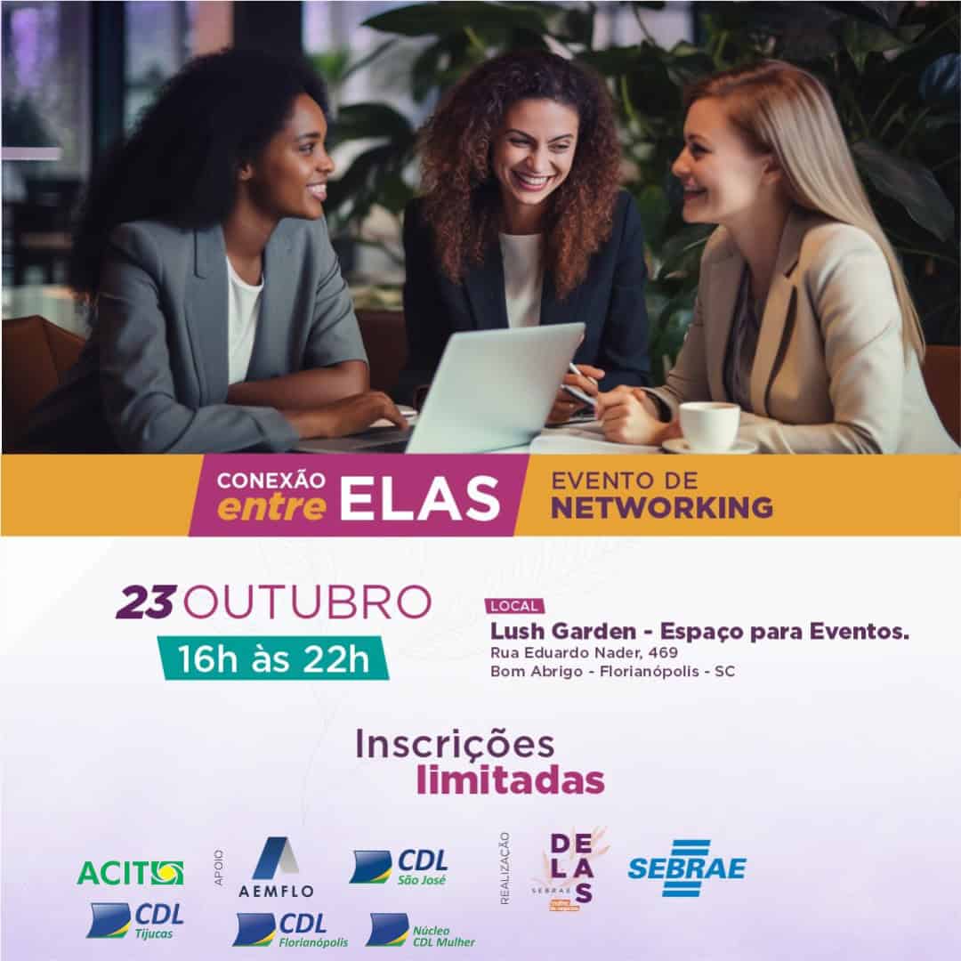 O Programa Sebrae Delas Mulher de Negócios, do Sebrae/SC, promove um encontro de networking exclusivo a mulheres empreendedoras, o Conexão Entre Elas, no dia 23 de outubro. O evento será realizado a partir das 16h, no LUSCH Garden – Espaço para Eventos. As inscrições podem ser feitas pelo link: https://sebrae.sc/conexao-entre-elas.
