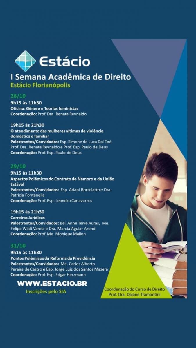 A primeira edição da Semana Acadêmica de Direito da Estácio Florianópolis vai oferecer a alunos e ao público em geral quatro dias de palestras, oficinas e mesas redondas. O evento ocorre entre os dias 28 e 31 de outubro. Somente a programação do dia 30 é restrita a alunos da instituição. Entre os temas em discussão estão a reforma da previdência, carreiras jurídicas, violência doméstica contra a mulher e feminismo. Todas as atividades são gratuitas e abertas ao público.