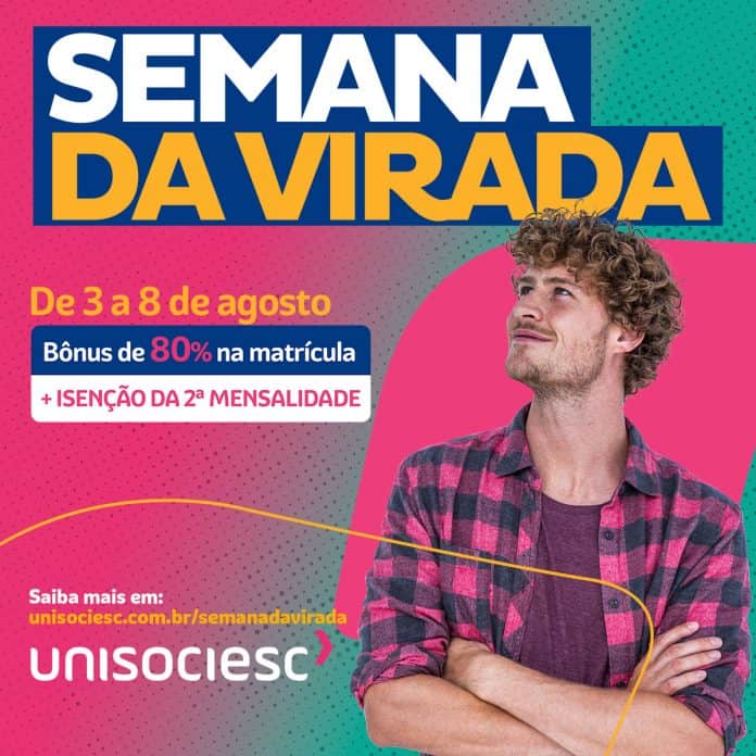 A Semana da Virada é um momento especial, voltado especialmente para quem quer começar a estudar ainda em 2020. Nela, há todas as oportunidades para ingressar na UniSociesc, com destaque para as condições especiais: 80% de isenção na matrícula e isenção da 2ª mensalidade. Haverá também vestibular agendado digital, análise de documentação para transferência e tour virtual pelas unidades da UniSociesc. Para o atendimento, os candidatos deverão agendar o melhor horário pelo site unisociesc.com.br/semanadavirada.
