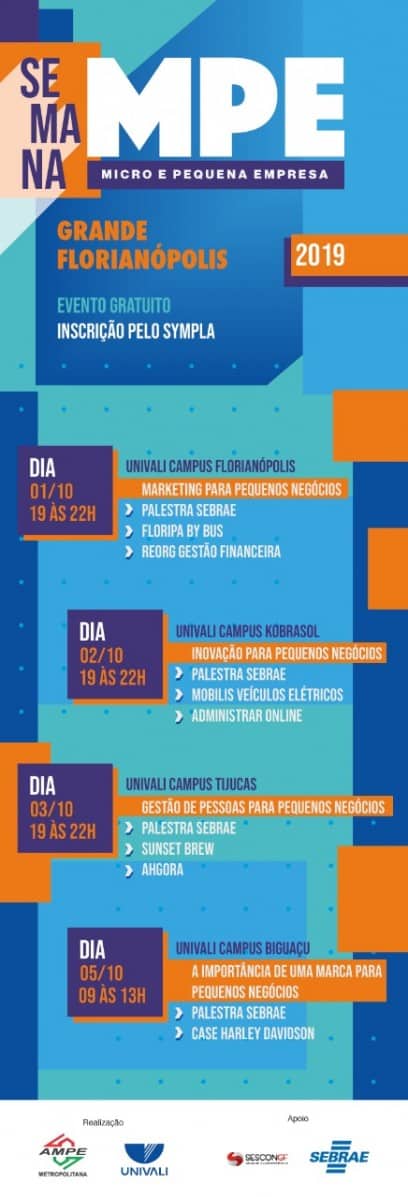Com palestras de capacitação aos empreendedores, a Semana MPE 2019 inicia dia 1º e vai até 5 de outubro, Dia Nacional da Micro e Pequena Empresa. As atividades são gratuitas e acontecem em Florianópolis, São José, Tijucas e Biguaçu. A organização é da Ampe Metropolitana e Universidade do Vale do Itajaí (Univali), com apoio do Sebrae/SC e Sescon Grande Florianópolis.