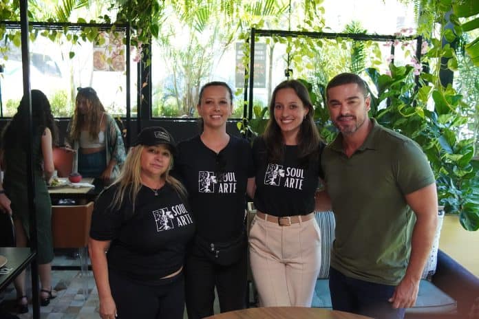 No elenco, atores catarinenses, incluindo pessoas autistas, contracenam com o ator paulista Sidney Sampaio. A série está sendo negociada com dois canais de streaming e deve chegar ao público até o final do ano. Na foto, Rayssa de Castro, Morgana Lopes, Carolina Lopes e Sidney Sampaio no café e restaurante Magnólia, na Bewiki.