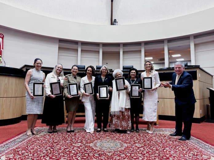 Oito mulheres consideradas referências para Santa Catarina foram homenageadas pela Assembleia Legislativa (Alesc) na noite desta segunda-feira (6), em sessão especial realizada no Plenário Deputado Osni Régis. O evento, proposto pelo deputado estadual Mário Motta (PSD), reconheceu a relevância do papel feminino na política, segurança pública, justiça, comunicação, empreendedorismo e no terceiro setor.