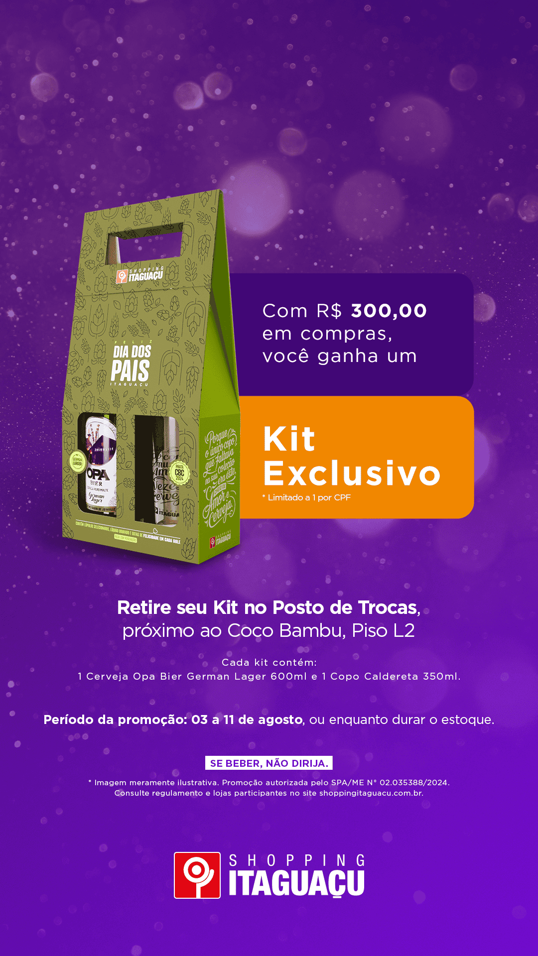 O Shopping Itaguaçu está com uma campanha especial para o Dia dos Pais, que celebra o amor e o companheirismo em todos os momentos, oferecendo um brinde exclusivo para celebrar essa data tão especial. Entre os dias 3 e 11 de agosto, os clientes que realizarem compras no valor de R$300 ou mais terão direito a um kit exclusivo, com estoque limitado.
