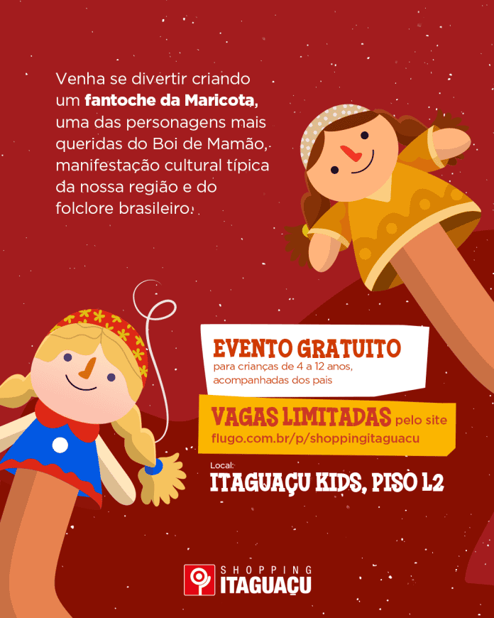 Em celebração ao Dia do Folclore Brasileiro, o Shopping Itaguaçu convida o público infantil para uma experiência lúdica e educativa: a Oficina Fantoche da Maricota. A atividade, gratuita e voltada para crianças, ocorre nos dias 23 e 24 de agosto, a partir das 15h, no espaço Itaguaçu Kids, localizado no piso L2.
