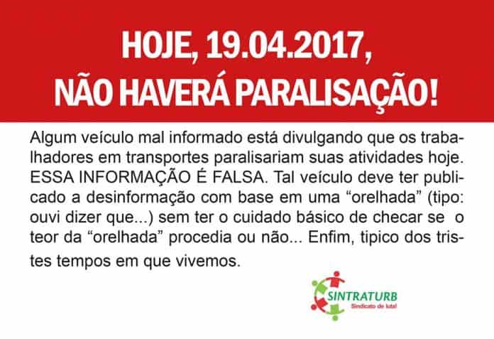 O sindicato que representa os motoristas e cobradores do transporte público de Florianópolis e região (Sintraturb) divulgou uma nota na manhã desta quarta-feira, 19, garantindo que não haverá nenhuma paralisação da categoria no dia de hoje.