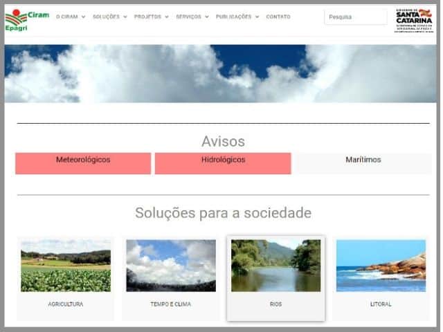 Agora, quem abre o site da Epagri/Ciram enxerga no topo os avisos meteorológicos, hidrológicos e marítimos, que estarão destacados com uma caixa vermelha quando estiverem ativados. Logo em seguida aparece a seção Soluções para a Sociedade, que reúne os produtos mais acessados pelos usuários.