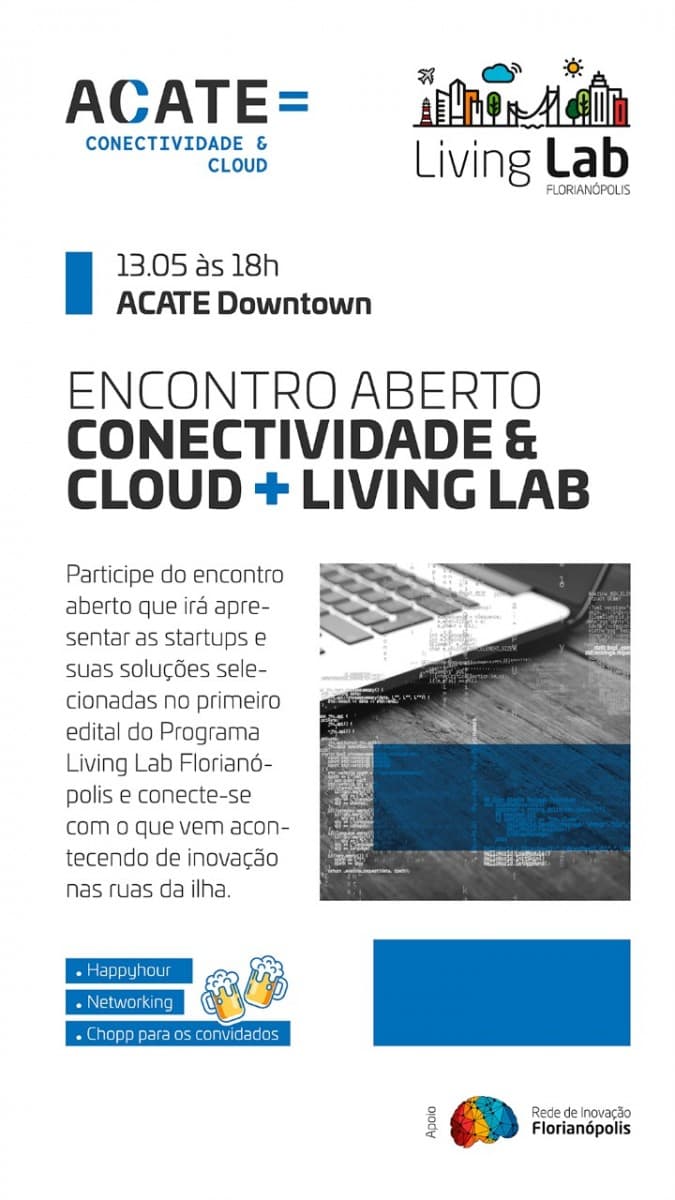 As dez startups que tiveram seus projetos selecionados pelo primeiro edital do programa Living Lab Florianópolis vão apresentar os resultados parciais dos testes de cada uma das soluções em encontro promovido pela vertical de Conectividade & Cloud da Associação Catarinense de Tecnologia (Acate). O evento acontece nesta segunda-feira, 13, a partir das 18h, na CIA Acate Downtown, rua Felipe Schmidt, 835, Centro. Após a apresentação, será promovido um Talk e Networking entre os participantes. O evento é aberto ao público e as inscrições devem ser feitas pelo link http://bit.ly/EncontroLivingLab.