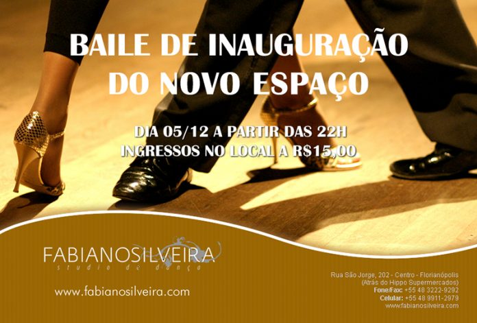 O Studio de Dança Fabiano Silveira, neste sábado (5.12), às 22h00, abrirá as portas para o baile de inauguração de seu novo espaço. Planejado pelo próprio diretor da escola, trata-se de uma sala de 80 metros quadrados e pé direito de cinco metros, totalmente climatizada e com aparelhagem de som moderna. O ambiente, de decoração clean – composta basicamente por paredes pretas, espelhos e veludos –, terá múltipla funcionalidade, como a realização de aulas, festas, reuniões com data show, encontros, coquetéis e eventos diversos.