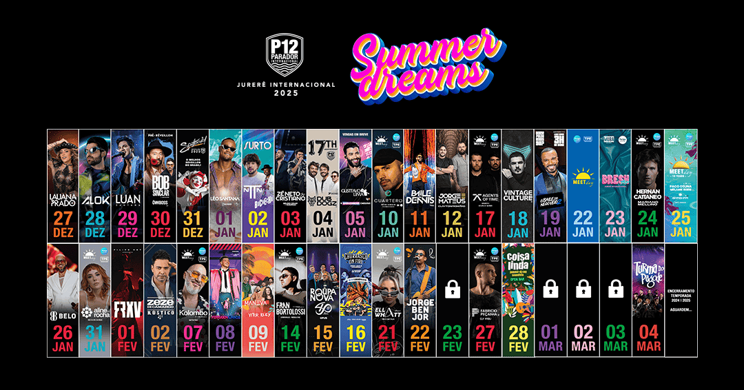 A temporada de verão 2025, intitulada “Summer Dreams – O Verão dos Seus Sonhos!”, reflete a proposta do P12 de proporcionar uma experiência inesquecível para o público. Em um cenário paradisíaco em Jurerê In, o Parador se consolida mais uma vez como um dos destinos mais procurados do Brasil durante o verão, reunindo grandes eventos que movimentam a economia e o turismo da capital catarinense, Florianópolis.