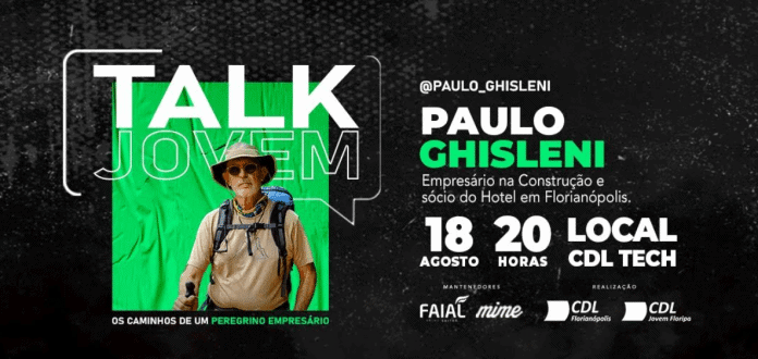 O Talk Jovem desta quinta-feira, 18, promovido pela CDL Jovem de Florianópolis, receberá o empresário e escritor Paulo Ghisleni para compartilhar a vivência durante a escrita e a peregrinação dos 3.270 quilômetros ou 6 milhões de passos, em 135 dias de longas caminhadas quase anuais.