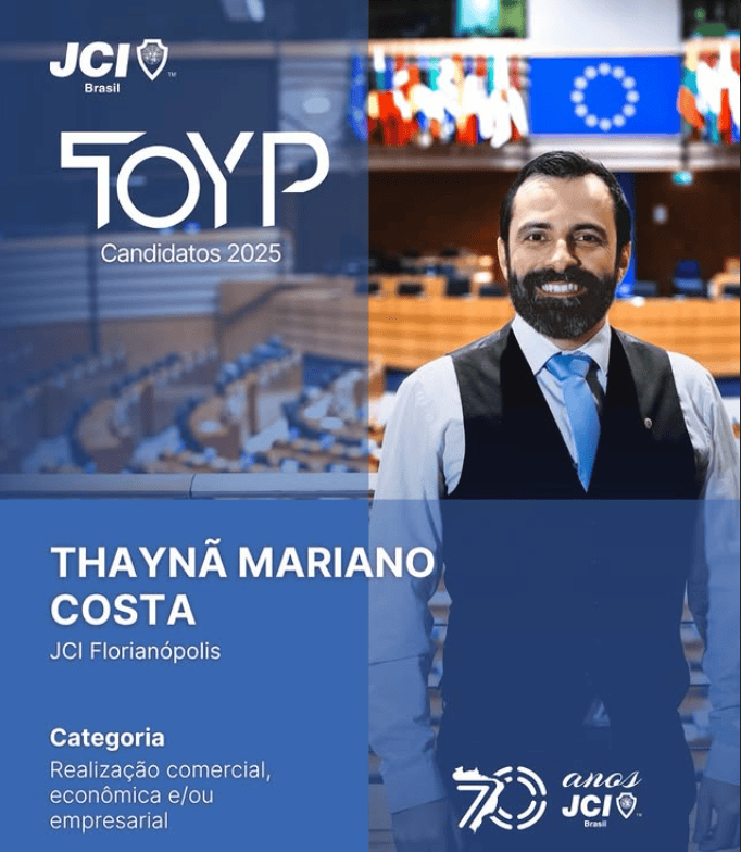 O jovem empreendedor e líder comunitário Thaynã Mariano Costa, membro da JCI Florianópolis, foi indicado ao prêmio TOYP JCI Brasil 2025 (Ten Outstanding Young Persons) na categoria Realização comercial, econômica e/ou empresarial. A honraria reconhece jovens de destaque que, por meio de suas ações, promovem impactos positivos e inspiram mudanças em suas comunidades.