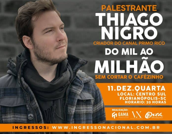 Thiago Nigro, criador do Canal Primo Rico, traz para Florianópolis sua concorrida palestra “Do Mil ao Milhão – sem cortar o cafezinho", baseada em seu livro que tem o mesmo nome (que consta em 4º lugar entre os livros mais vendidos do ano pelo ranking da Publishnews). Na palestra, Thiago busca descomplicar o mundo do investimentos e mostra caminhos para a conquista da tão sonhada independência financeira, assim como faz em seu canal que conta com 2,2 milhões de inscritos e mais de 100 milhões de visualizações de seus videos. O evento acontece no dia 11 de dezembro no CentroSul e os ingressos já estão sendo comercializados pelo site Ingresso Nacional: https://www.ingressonacional.com.br/evento/14872/do-mil-ao-milhao-sem-cortar-o-cafezinho.