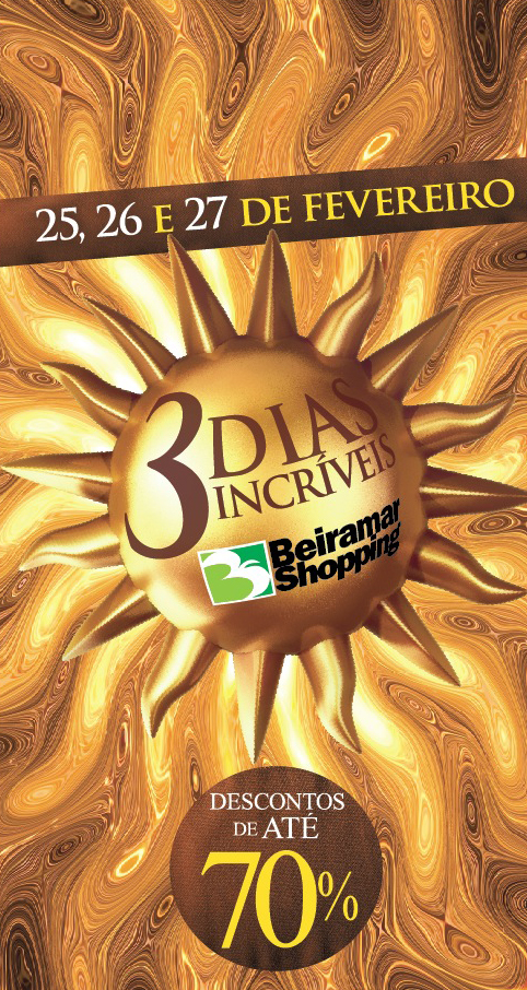 Começa nesta quinta-feira, 25 de fevereiro, a promoção “Três Dias Incríveis” do Beiramar Shopping. Até o sábado, dia 27, todas as lojas do empreendimento vão liquidar seus estoques e coleções de verão com mega descontos. E para atrair a atenção do cliente, vale tudo: vitrines móveis pelos corredores do shopping, banda de fanfarra, além de decoração especial no mall.