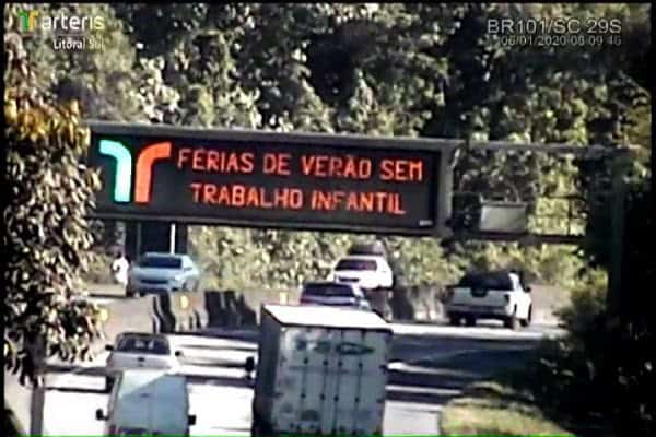 Os turistas que chegam a Santa Catarina para as férias de verão por via terrestre, são orientados a denunciar os flagrantes de trabalho infantil e a exploração sexual contra crianças e adolescentes na alta temporada. Ao longo da BR-101 aparece a mensagem “Férias de verão sem trabalho infantil. Polícia Rodoviária Federal, Arteris e Ministério Público do Trabalho — Disque 100”.