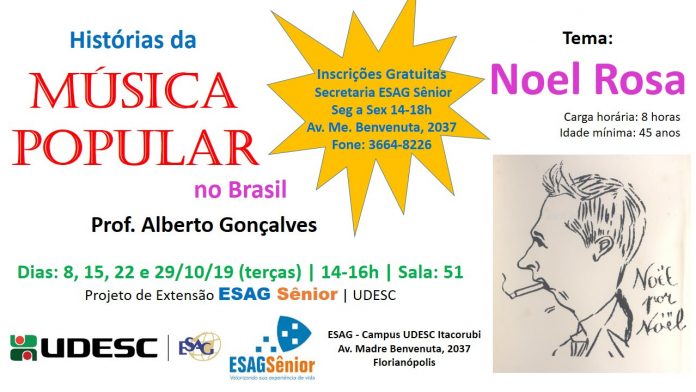 A partir desta terça-feira, 8, o projeto de extensão Esag Sênior, da Universidade do Estado de Santa Catarina (Udesc), vai oferecer o curso Histórias da Música Popular no Brasil. Com carga horária de 8 horas, as aulas serão ministradas todas as terças-feiras do mês de outubro, das 14h às 16h, na sala 51 da Udesc Esag. A idade mínima para participar é 45 anos.