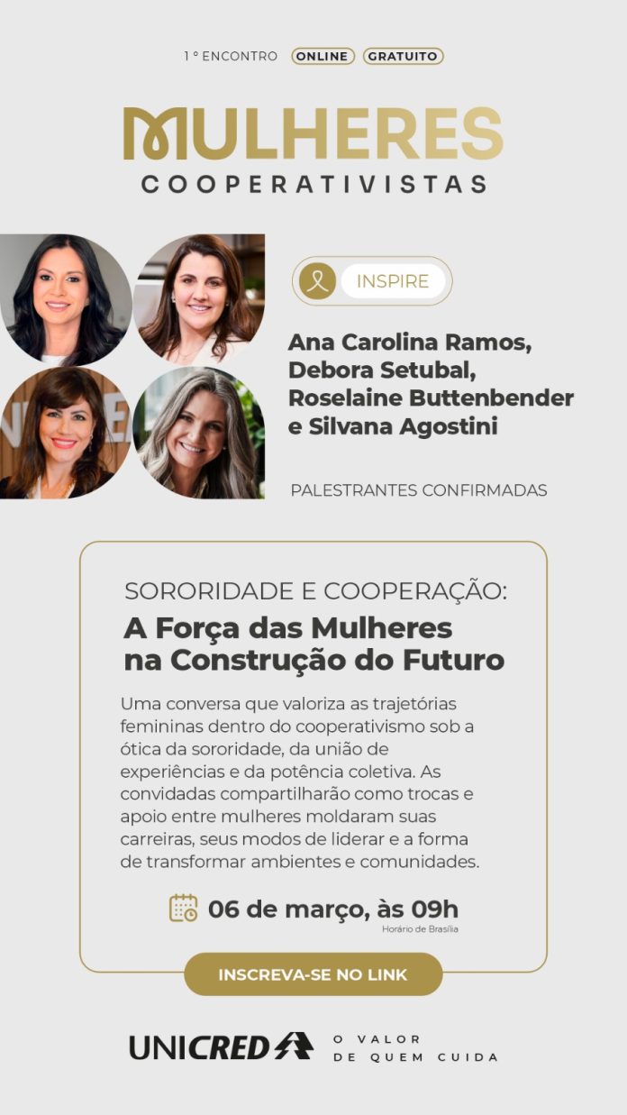 A Unicred promove, no dia 6 de março, às 9h (horário de Brasília), o 1º encontro de 2026 do Programa Mulheres Cooperativistas (MCoop). O evento será online, gratuito e aberto ao público, com transmissão ao vivo pelo YouTube.