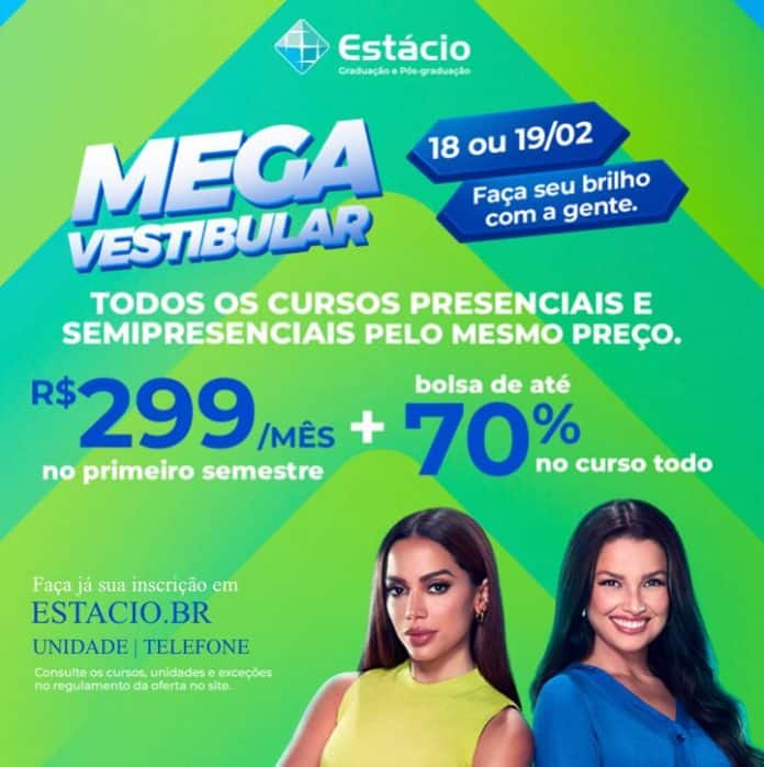 Com o Megavestibular Brilho Duplo é possível iniciar uma graduação com preços únicos. Na modalidade Presencial ou Semipresencial o valor é de R$ 299/mês durante 6 meses. Já quem optar pelos formatos Flex e de Ensino Digital, o valor é de apenas R$ 129/mês por 6 meses. Em todas as modalidades os candidatos ainda podem garantir também até 70% de bolsa no curso todo. A campanha não contempla o curso de Medicina. As inscrições são gratuitas. Confira as condições e os cursos disponíveis na ação diretamente nas Unidades ou Polos de Ensino Digital, pelo regulamento disponível no site estacio.br, ou pelos telefones 4003-6767 (Regiões Metropolitanas) ou 0800 880 6767 (Demais regiões).