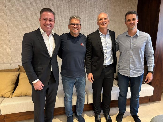 Foto (da esquerda para a direita): Iomani Engelmann, co-CEO e fundador da Pixeon; Paulo Felipe Martins, CEO da Vela Latam; Roberto da Cruz, co-CEO da Pixeon; Lucas Machado Coelho, vice-presidente de M&A da Vela Software